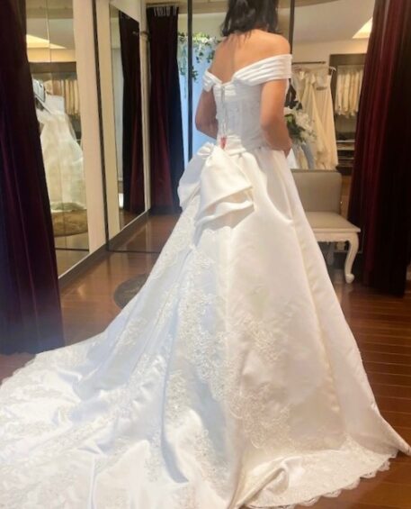 上品な光沢が美しいサテン素材のオフショルダードレス。バックスタイルの大きなリボンと、繊細なロングトレーンがエレガントな雰囲気を演出。本格的なレストランウェディングの撮影におすすめです